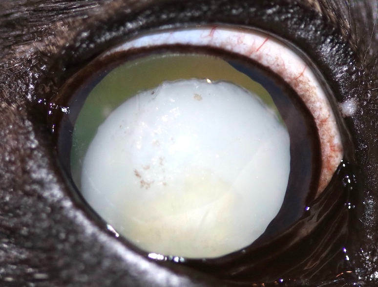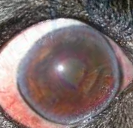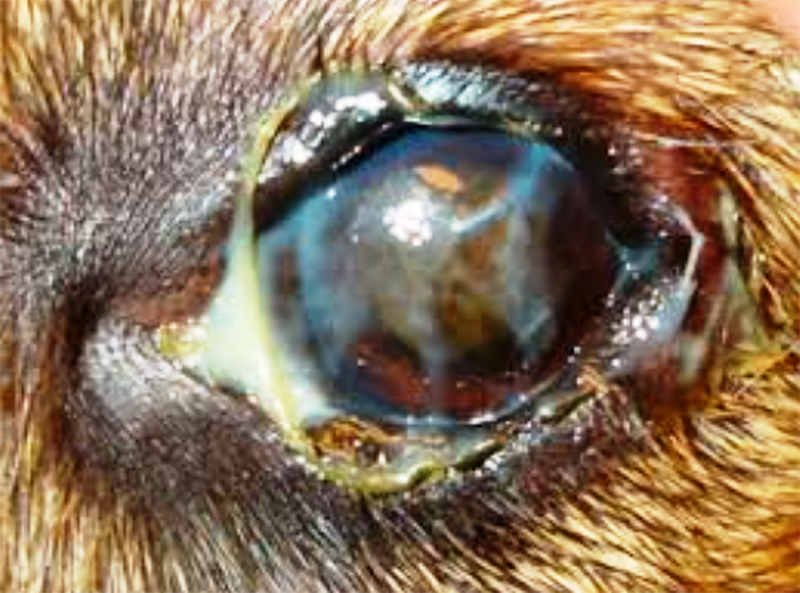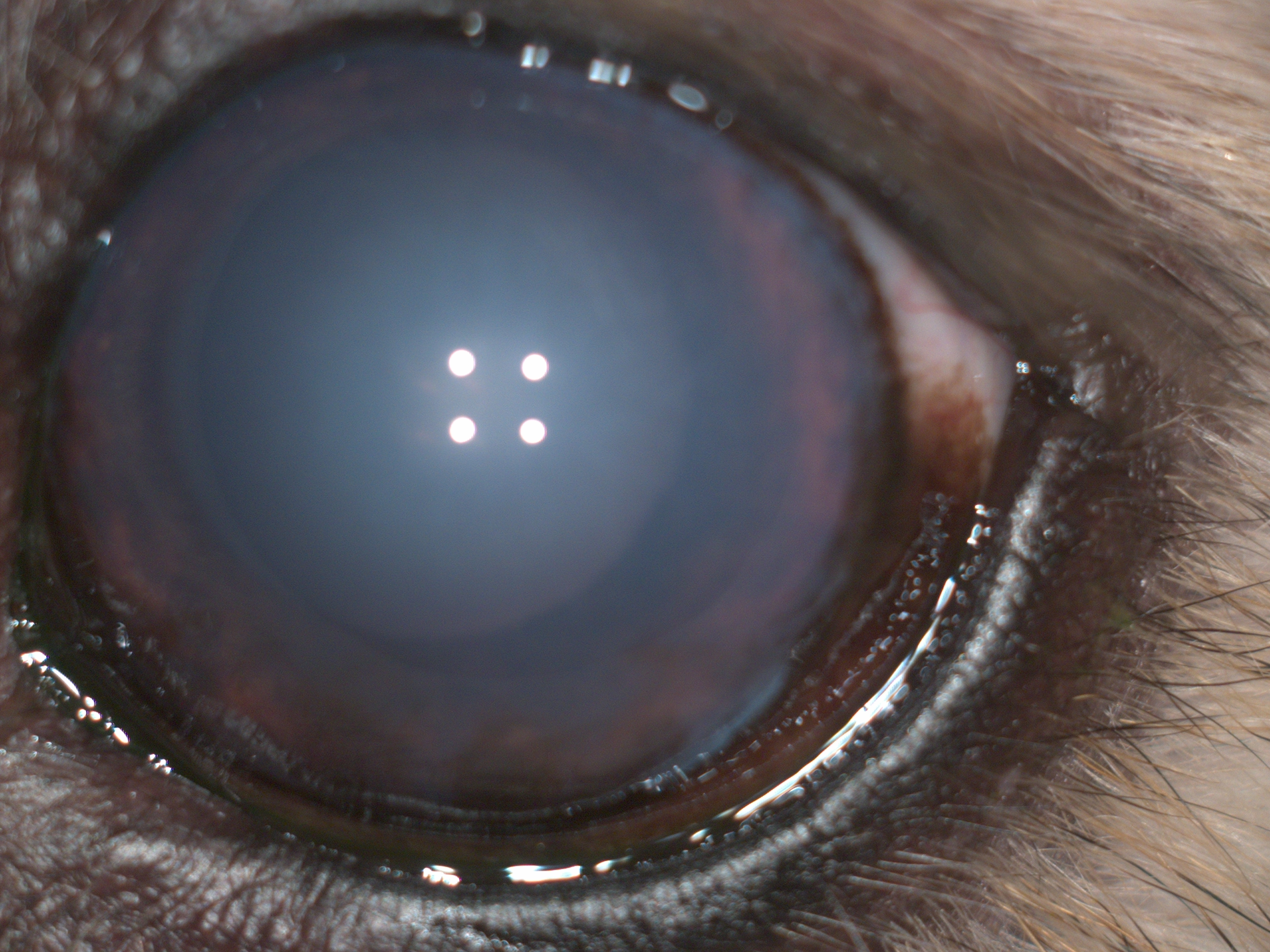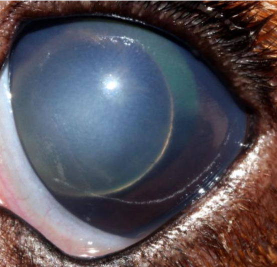 Starke Pigmentablagerung, die Hornhaut ist undurchsichtig, der Hund kann nicht sehen.
