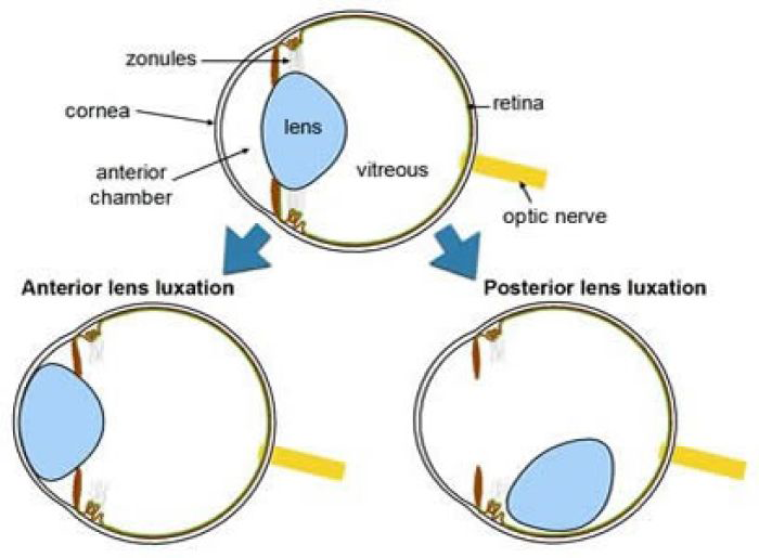 Tritt meist bei bestimmten Hunderassen auf, z. B. bei Terriern (Jack Russell, Parson Russell, Foxterrier), Border Collies oder Shar-Peis. Grund: Schwäche der Zonulafasern, die die Linse im Auge halten.